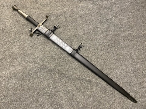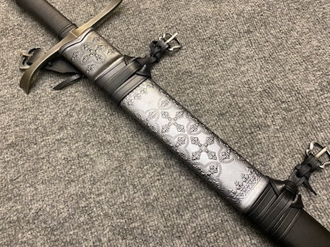 VA-144 German Long Sword with a modified VA-107 S-shaped guard Felt-lined scabbard and antiqued grey fittings.